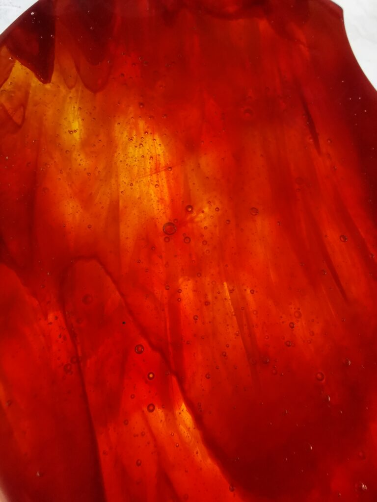 - Szkło bezbarwne wzbogacane pudrami szklanymi oraz ewentualnie farbami fusingowymi – w zależności od wielkości – jest to mniej szlachetne szkło, a kolor uzyskujemy przez dodanie niewielkiej ilości sproszkowanego szkła kolorowego. Natomiast może bardzo dobrze sprawdzać się w momencie kiedy chcemy uzyskać gradient kolorystyczny, oraz przy dużych elementach pomaga utrzymać koszty w rozsądnych ryzach. Ze względu na niższe koszty materiałów ponad 90% wszystkich prac fusingowych które spotykacie na rynku jest wykonywane tą techniką.